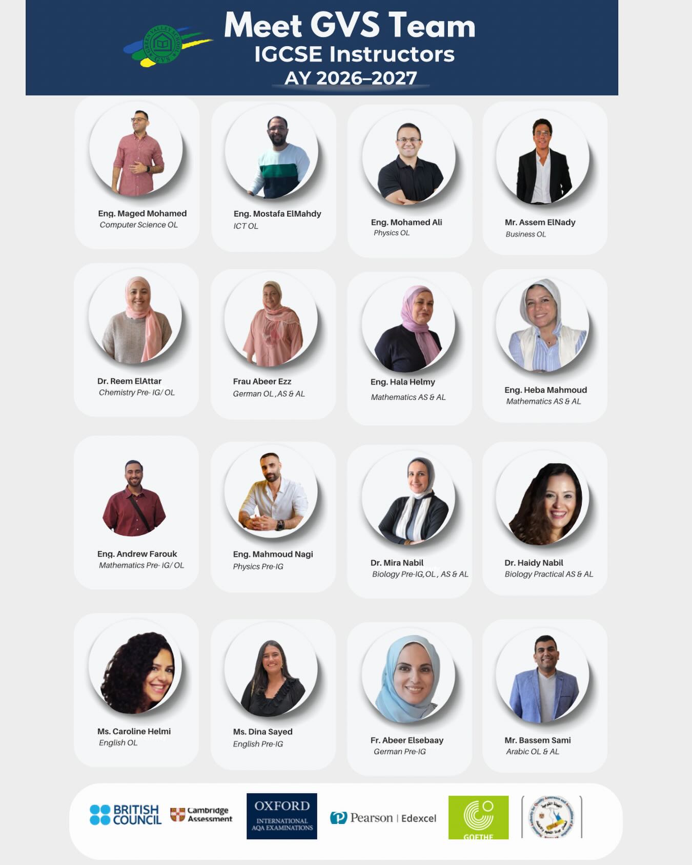 GVS is granted accreditation by the University of Cambridge (Cambridge Assessment International Education), Pearson Edexcel Examinations, and Oxford International AQA Examinations, United Kingdom. All accreditations are under the license of the Ministry of Education and supervised by the British Council